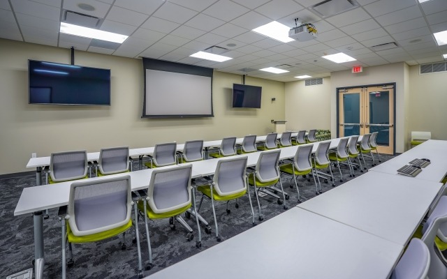 This new 11,200 project is a build-to-suit office building in Grand Island, Nebraska for Lutz & Company, PC. Roughly one-third of the occupied space consists of offices around the perimeter with the remaining two-thirds consisting of a lobby and central bullpen to house employee workstations. The new building allows for the company to promote collaborative teamwork and serves as a central location for their team to work in. The building houses offices, a kitchen and conference space. Other interesting features of this project include a wooden architectural structure towering behind the reception area and the company's colors powerfully displayed throughout the office.