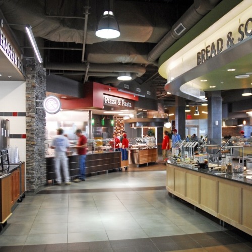 The Abel Sandoz Dining Center was part of a 40,000 SF renovation over a two-year period. The mechanical, electrical and fire suppression systems were completely removed and replaced with systems engineered for the new areas. The renovated, naturally lit space invites students, faculty and visitors to enjoy market-style dining on campus. The Center provides a combination of booth, high-top and regular table seating for 450 people and features a variety of food stations. A panoramic view of the Antelope Creek Project can be seen through windows that span from the floor to the ceiling of the dining center.
